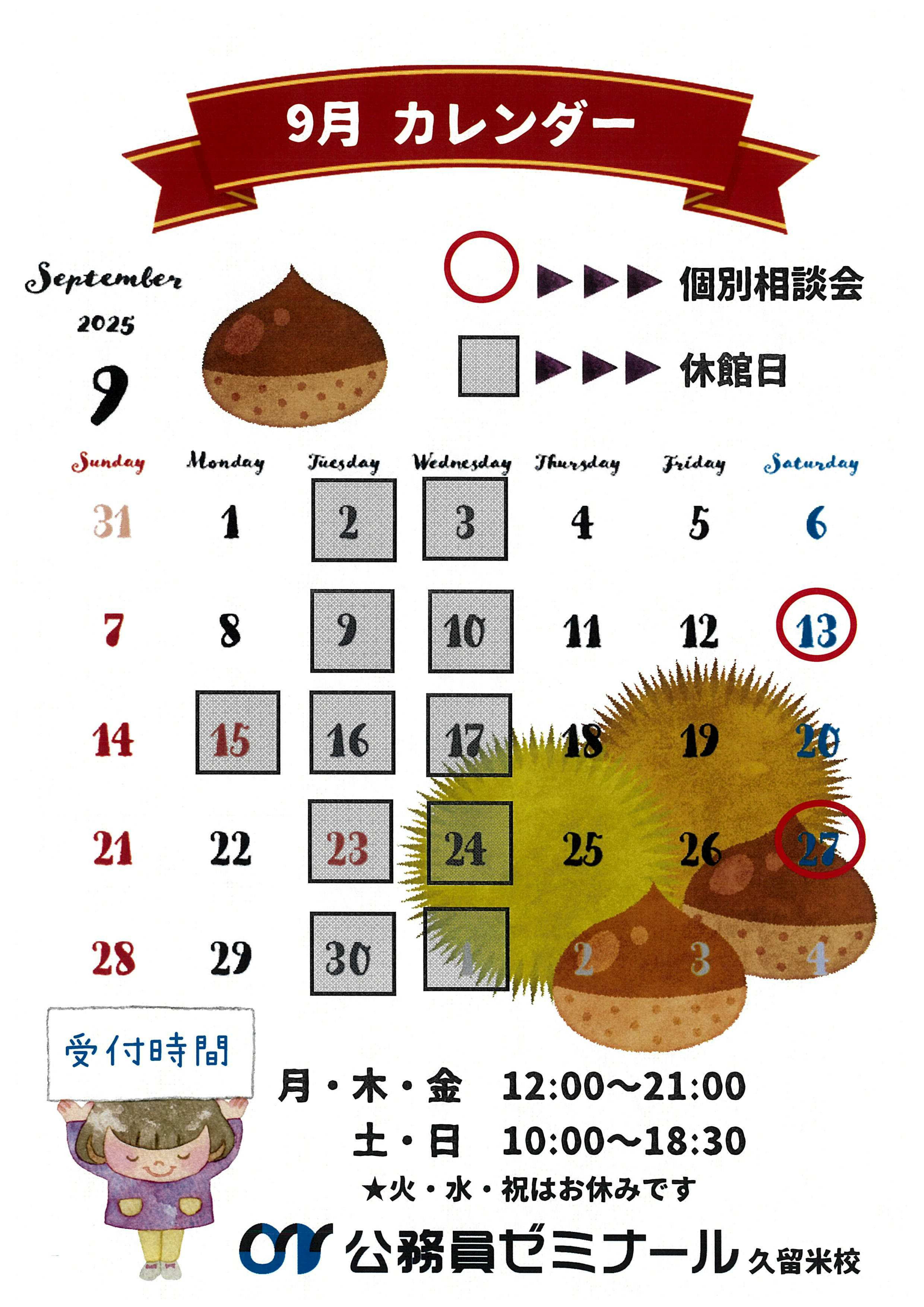 久留米校の特徴は、なんといってもアットホームな雰囲気。学習上のことでも将来のことでも、どんなことでも誰もが気軽に質問・相談できます。まったくの公務員受験初心者も安心して学べる雰囲気と万全な指導体制であなたをサポートします!また、校舎は西鉄久留米駅前にあるので電車の発車ギリギリまで勉強できますよ!